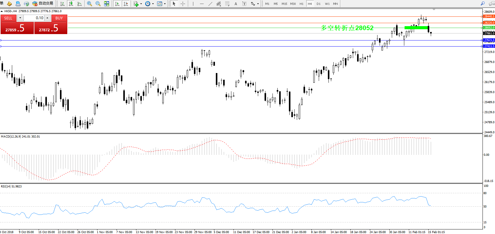 恒指HK50 ——4小时K线图显示:
