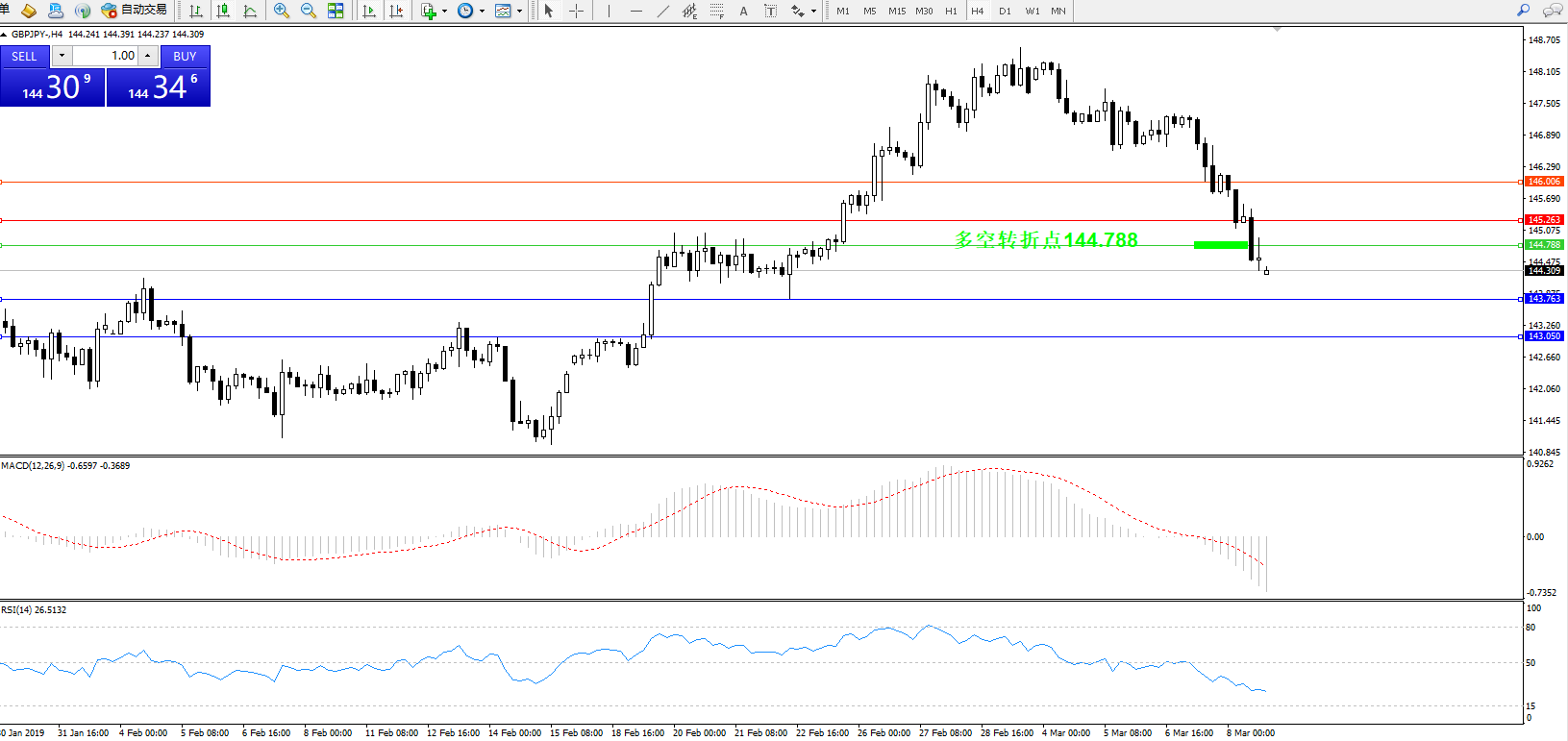交易策略:144.788下方看跌,目标143.763143.050