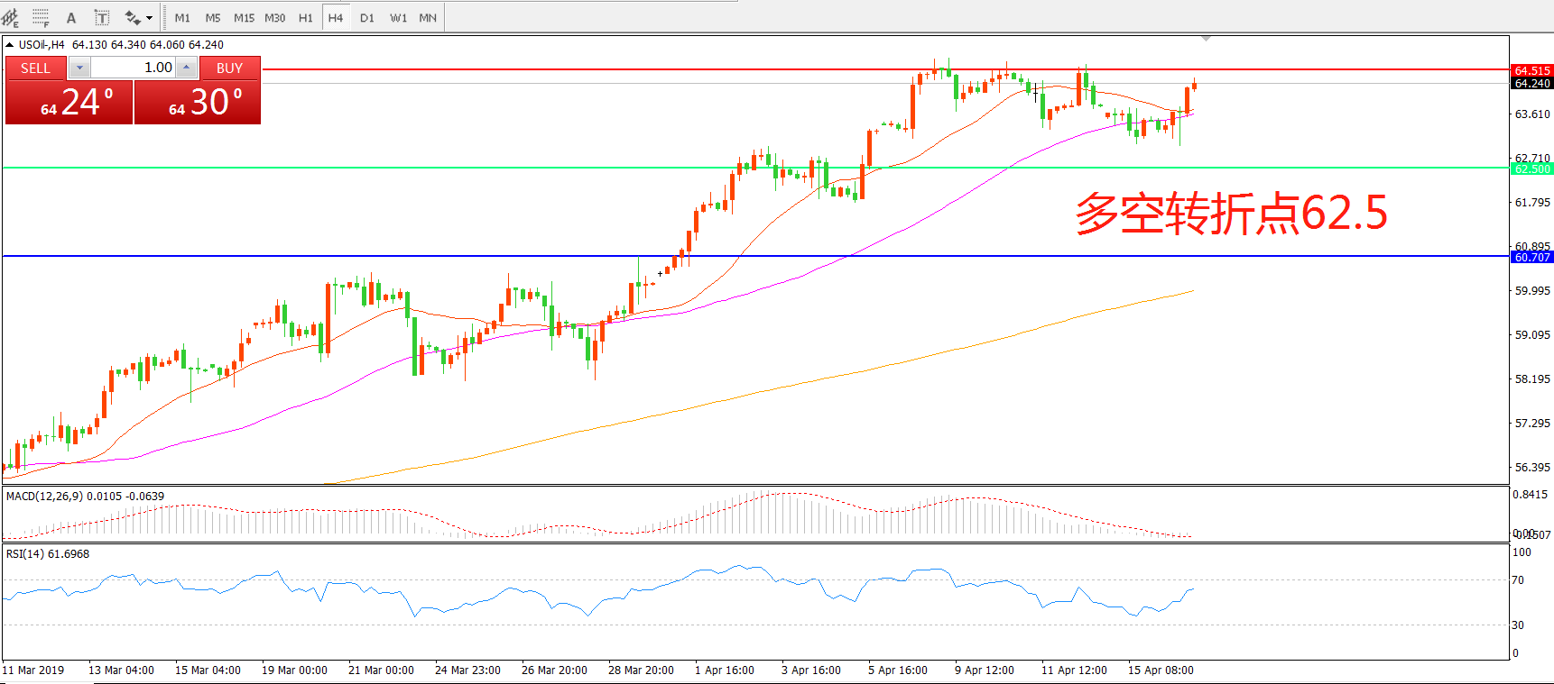 4小时图看,油价触碰55均线后出现反弹,阳线连续拉升,短线走势偏强,MACD红柱减少,RSI指标向上,重点关注上方64.5一线阻力,突破后或将开启新一波拉升。