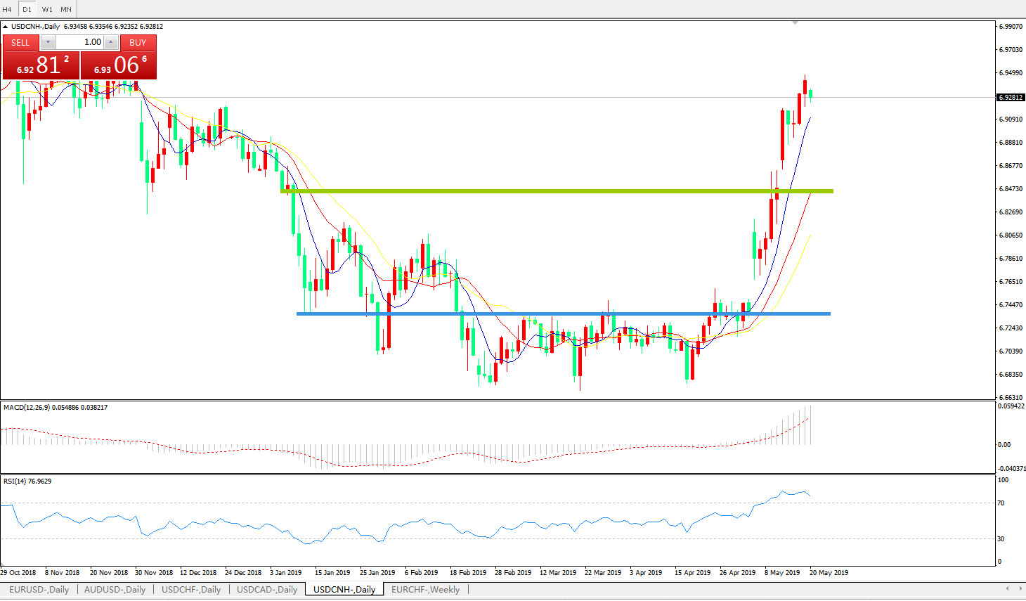 技术面简析:日线均线呈有序多头排列看多,MACD0轴上方运行且动能柱0轴上方持续放量RSI超买区域有下行迹象,汇价强力上攻后维持整理态势,预计短期汇价有进一步上行空间,中期重点关注中美贸易争端后续进展