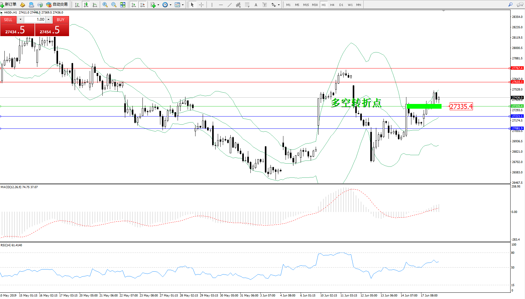 香港恒生指数618日(周二)收盘上涨271.61点,涨幅1.00%,报27498.77点;中国和美国将在本月晚些时候举行的20国集团(G20)峰会之前重启贸易谈判,这激起了人们对两国将解决难以平息的贸易战的希望。利好消息暂时匮乏之下,市况表现牛皮,消息股炒作持续,本地地产股持续有资金流入,特别是跟随大市调整之时,料市场仍看好本地地产行业稳定发展,本周市场将续以炒作美国减息为主流。