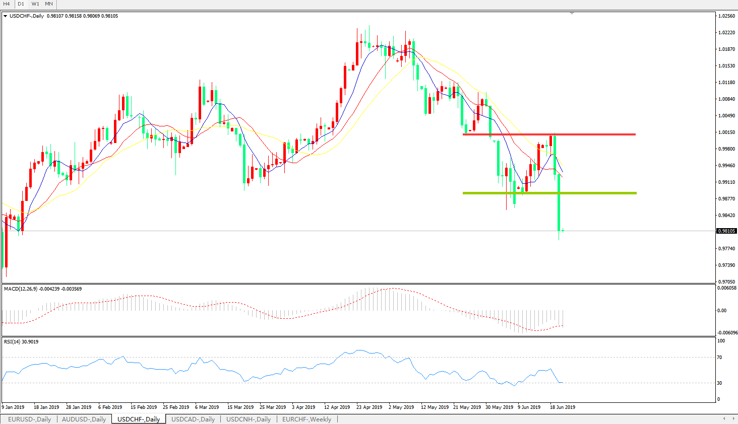 技术面简析:日线图均线再度空头排列,汇价暴跌击穿前低打开下行空间,MACD在0轴下方运行且动能柱再度放量,RSI逐步走低,预计汇价将进一步下行。