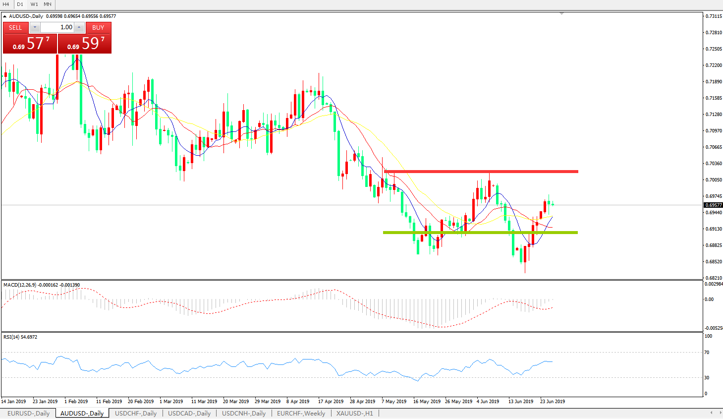 技术面简析:日图均线缠绕粘合,汇价延续温和反弹整理态势,MACD在0轴下方运行且动能柱量能持续衰弱,RSI反弹后逐步走缓,汇价短期在贸易战及美联储货币政策影响下仍有反弹空间,但中期依旧考虑逢高做空。