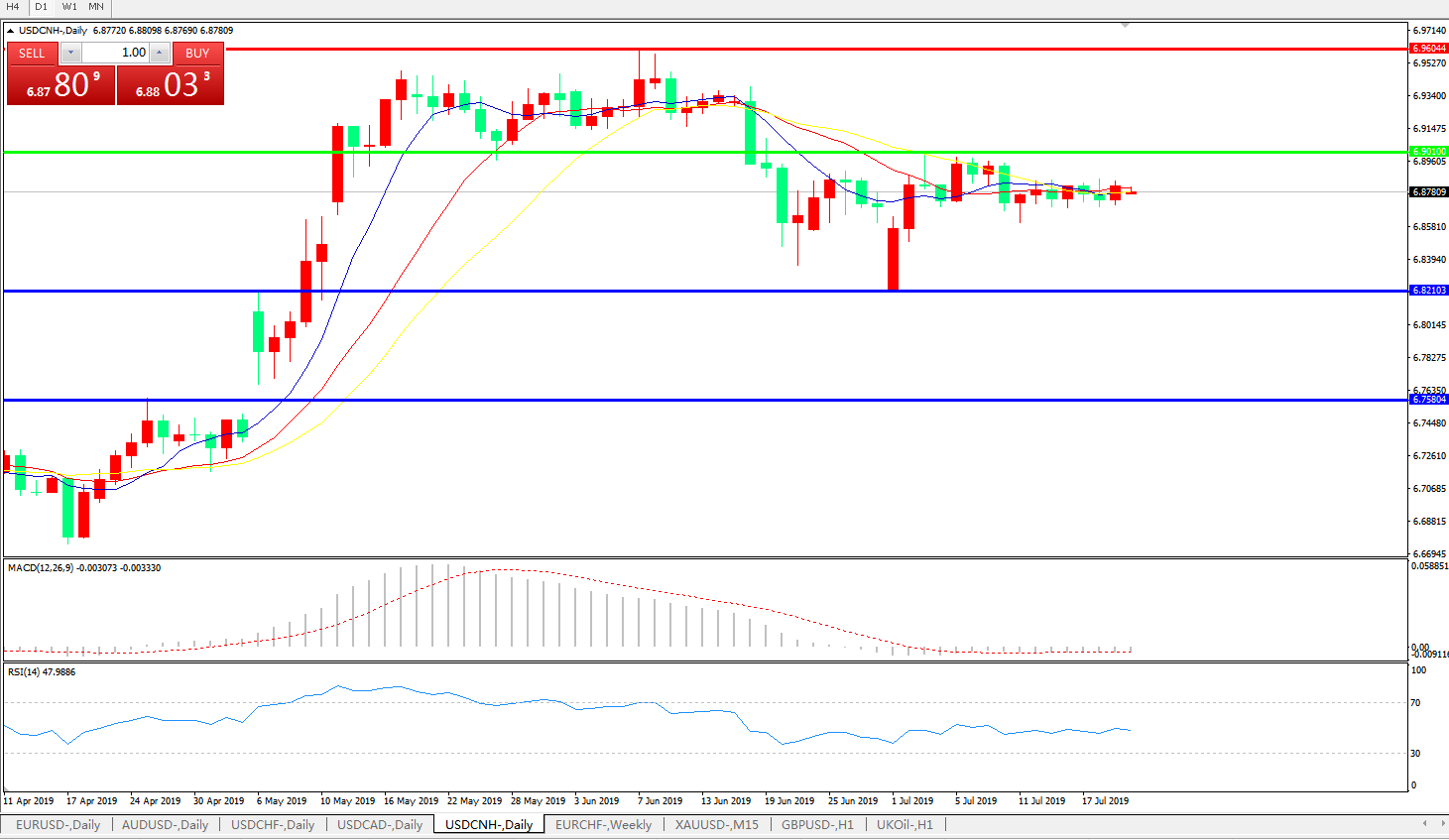交易策略: 在6.9010之下,看跌,目标价位为6.8210,然后为6.7580。