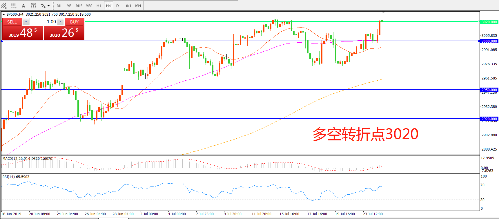 4小时图看,标普500在3000点附近争夺后长阳突破,整体走势偏强。MACD绿柱减少,RSI指标向下,日内震荡上行概率较大。