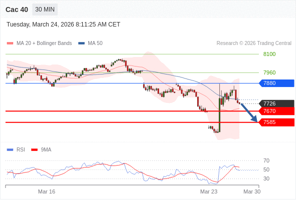 Cac 40 当日内: 短期关键阻力位在7880。