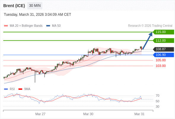 布伦特原油 (ICE) (M6) 当日内: 在106.90之上,看涨。