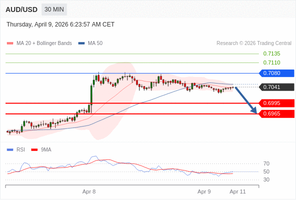 交易策略: 在 0.7080 之下,看跌,目标价位为 0.6995 ,然后为 0.6965 。