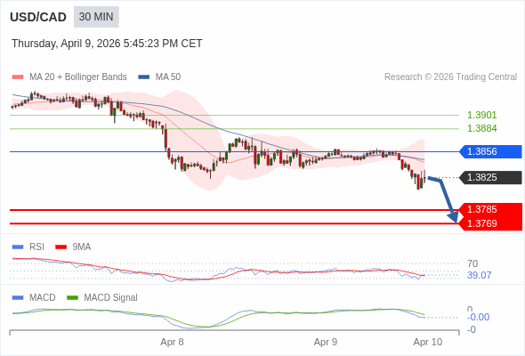 美元/加元 当日内 : 看跌,在 1.3856 之下。
