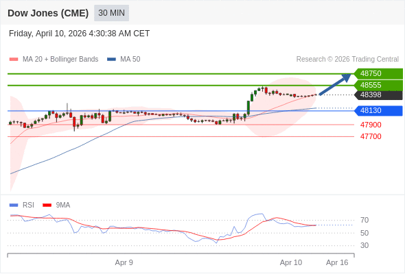 在 48130 之上,看涨,目标价位为 48555 ,然后为 48750 。