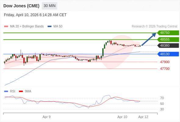 在 48130 之上,看涨,目标价位为 48555 ,然后为 48750 。