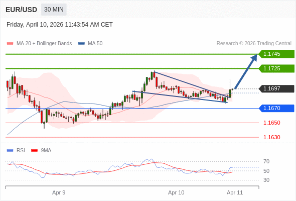 在 1.1670 之上,看涨,目标价位为 1.1725 ,然后为 1.1745 。