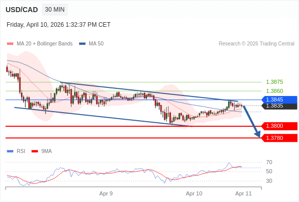 在 1.3845 之下,看跌,目标价位为 1.3800 ,然后为 1.3780 。