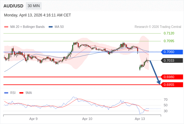 交易策略: 在 0.7060 之下,看跌,目标价位为 0.6980 ,然后为 0.6955 。