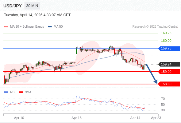 在 159.75 之下,看跌,目标价位为 159.00 ,然后为 158.60 。