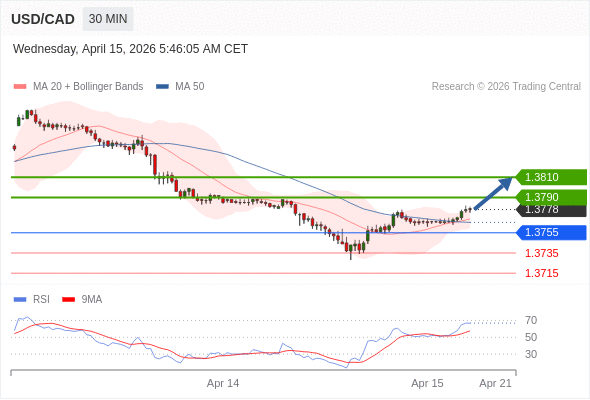 在 1.3755 之上,看涨,目标价位为 1.3790 ,然后为 1.3810 。