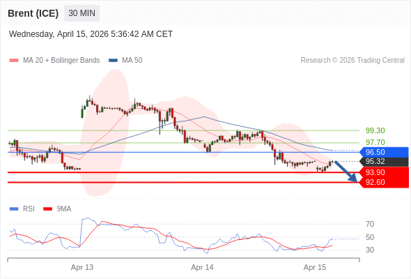 布伦特原油 (ICE) (M6) 当日内: 短期关键阻力位在96.50。