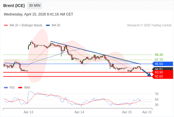 在 96.50 之下,看跌,目标价位为 93.90 ,然后为 92.60 。