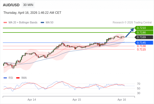 在 0.7145 之上,看涨,目标价位为 0.7190 ,然后为 0.7210 。