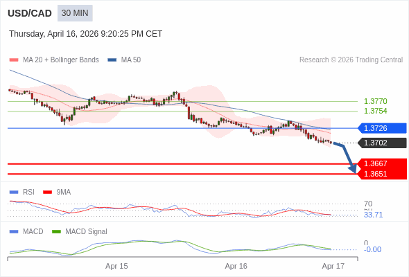 美元/加元 当日内 : 看跌,在 1.3726 之下。
