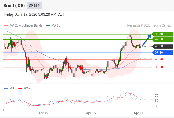 在 97.40 之上,看涨,目标价位为 99.10 ,然后为 99.80 。