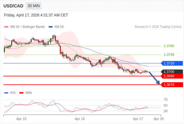 在 1.3720 之下,看跌,目标价位为 1.3690 ,然后为 1.3670 。
