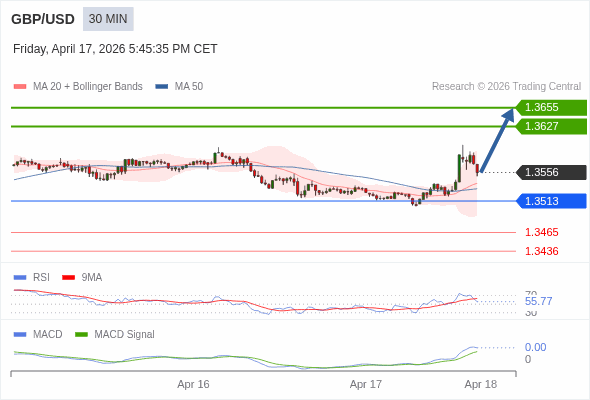英镑/美元 当日内 : 看涨,当 1.3513 为支撑位。