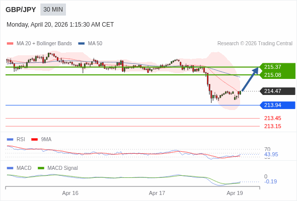 英镑/日元 当日内 : 有上涨的可能,目标价位定在 215.37 。