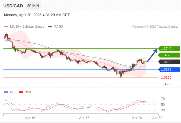 在 1.3675 之上,看涨,目标价位为 1.3720 ,然后为 1.3740 。