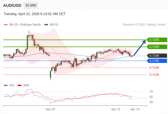 在 0.7155 之上,看涨,目标价位为 0.7185 ,然后为 0.7200 。