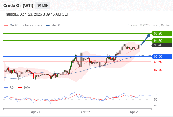 在 90.80 之上,看涨,目标价位为 94.50 ,然后为 96.20 。