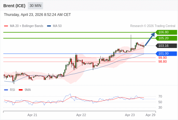 在 101.00 之上,看涨,目标价位为 105.20 ,然后为 106.80 。