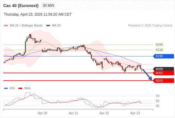 法国CAC指数期货 (Euronext) (K6) 当日内: 存在压力。