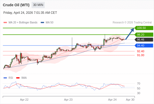 在 94.40 之上,看涨,目标价位为 98.20 ,然后为 100.50 。