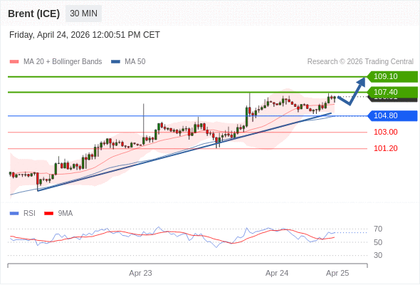 在 104.80 之上,看涨,目标价位为 107.40 ,然后为 109.10 。