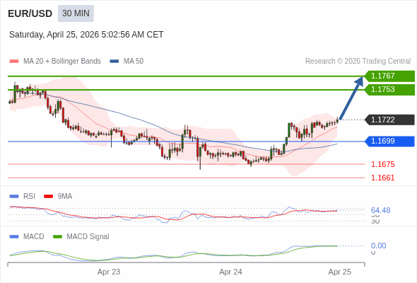 欧元/美元 当日内 : 看涨,当 1.1699 为支撑位,目标定在1.1767。
