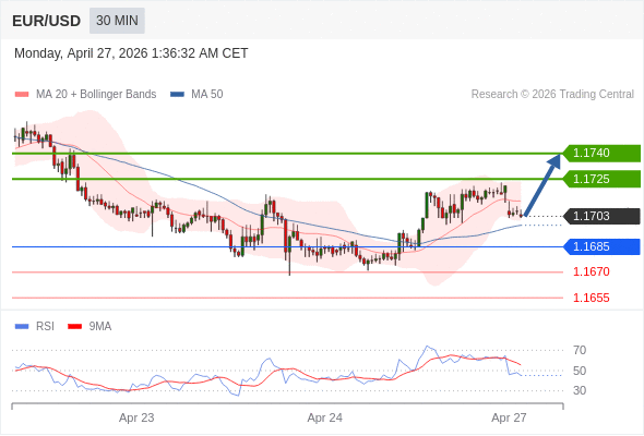 在 1.1685 之上,看涨,目标价位为 1.1725 ,然后为 1.1740 。