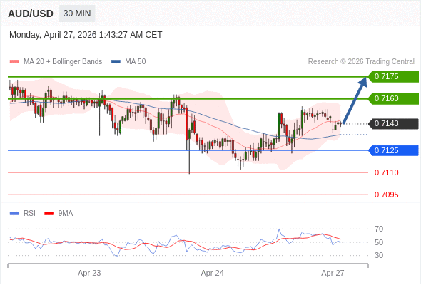 在 0.7125 之上,看涨,目标价位为 0.7160 ,然后为 0.7175 。