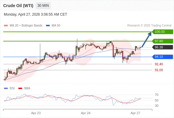 在 94.10 之上,看涨,目标价位为 97.80 ,然后为 100.00 。