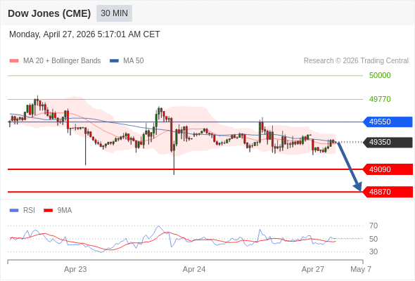 交易策略: 在 49550 之下,看跌,目标价位为 49090 ,然后为 48870 。