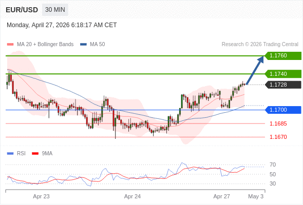 在 1.1700 之上,看涨,目标价位为 1.1740 ,然后为 1.1760 。