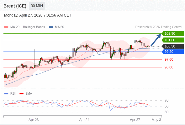 交易策略: 在 99.20 之上,看涨,目标价位为 101.60 ,然后为 102.90 。