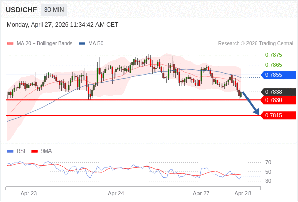在 0.7855 之下,看跌,目标价位为 0.7830 ,然后为 0.7815 。