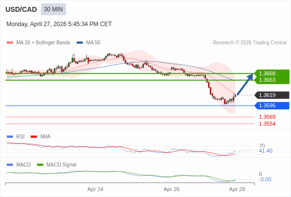 技术点评: RSI技术指标小于中性区域50。 MACD技术指标处在其信号线之上看空。 混合配置。 此外,价位低于其20天及50天移动平均线 ( 分别位于1.3621 和1.3651 )。