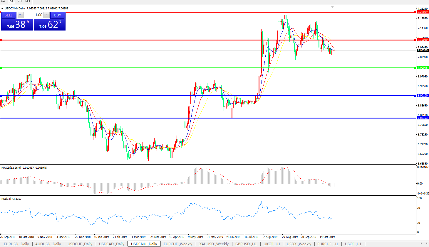 技术面简析:日图短期均线呈空头排列,汇价窄幅整理,MACD下穿0轴且量能0轴下方小幅放量,RSI走低后窄幅整理,预计短期汇价大概率将延续整理,汇价持续运行于7.00-7.10区间的概率较大;关注中美贸易谈判及美联储决议。