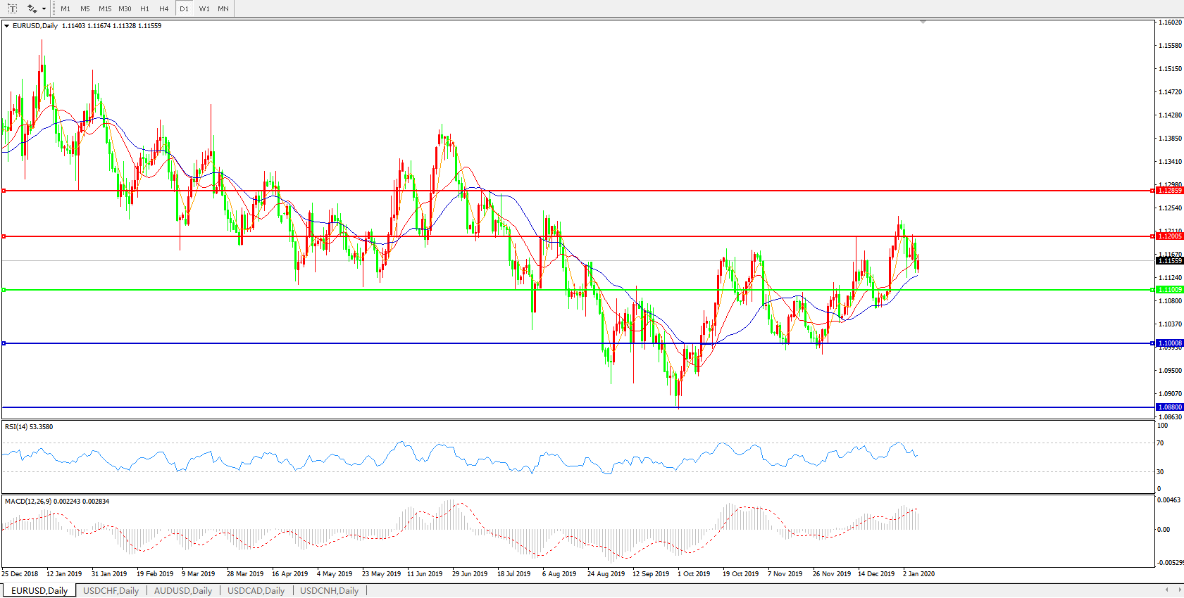 技术面简析:日图均线呈多头排列但短期均线明显走弱,汇价早盘小幅走高,MACD开始下行且量能萎缩 ,RSI震荡中缓步走低,预计汇价大概率将进一步整理震荡,重点关注1.12关口的短期争夺及下方1.11关口的支撑。