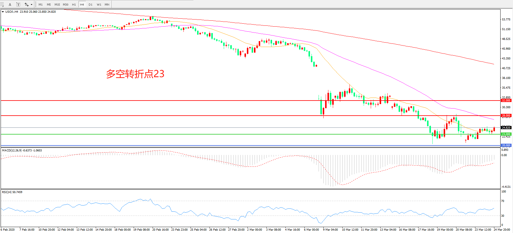 4小时图看,美油以23美元为支撑进行整理,整体出现止跌迹象,短期均线系统拐头,MACD绿柱减少,RSI指标走平,日内有可能出现反弹。
