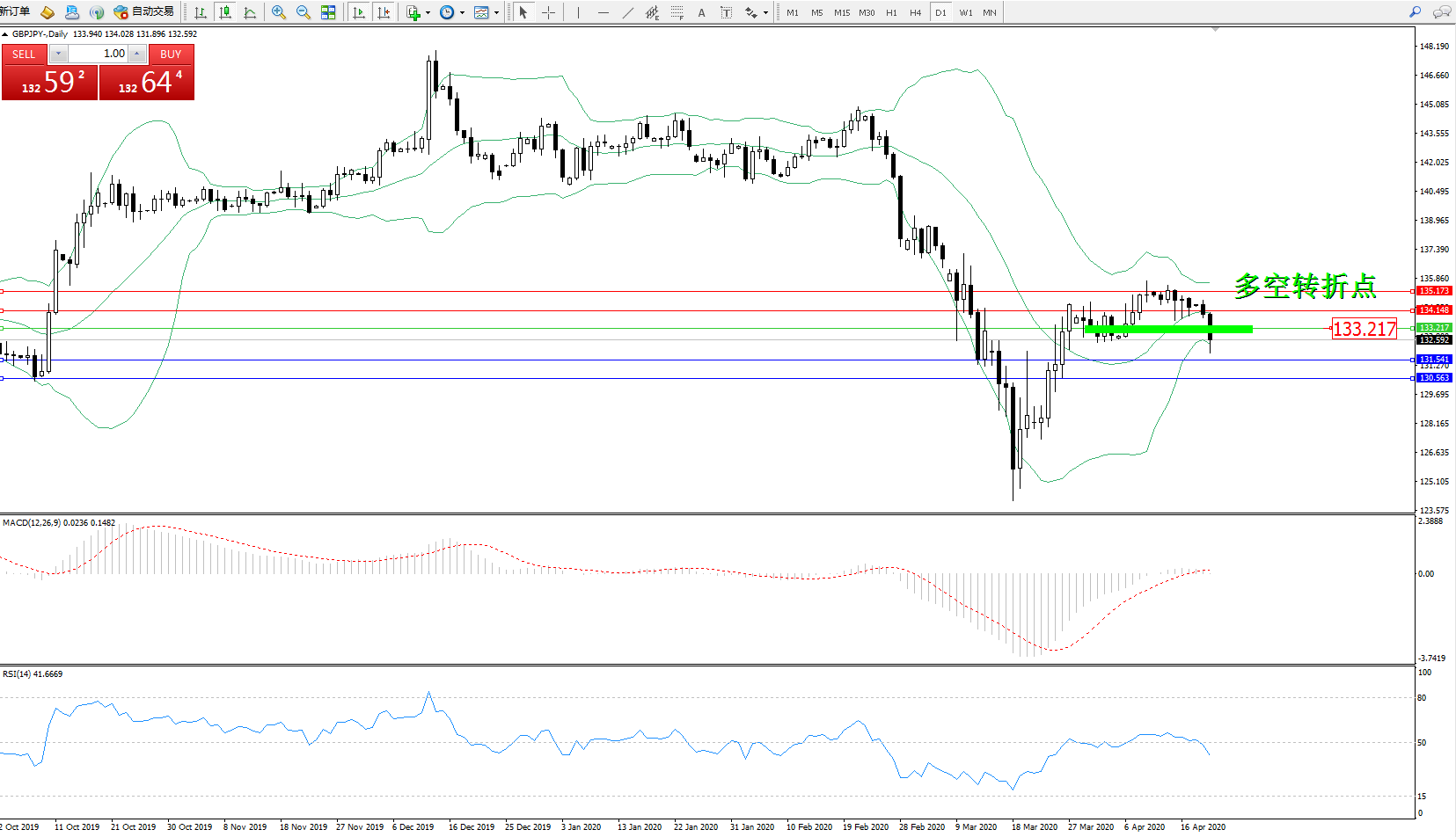 交易策略:133.217下方看跌,目标131.541130.563