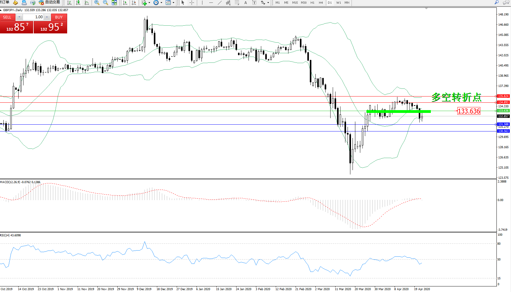 交易策略:133.636下方看跌,目标131.588130.563