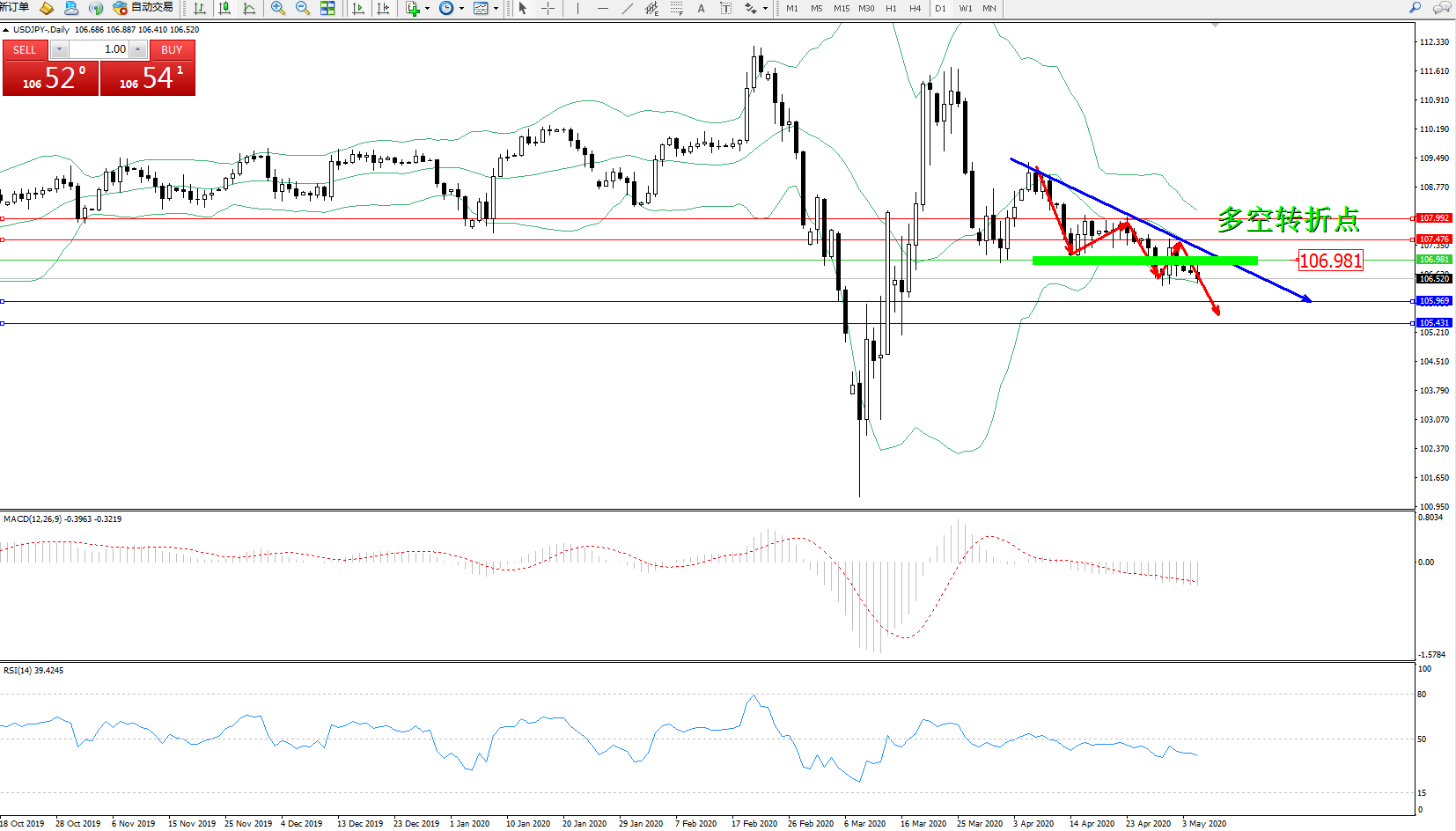 交易策略:106.981下方看跌,目标105.969105.431